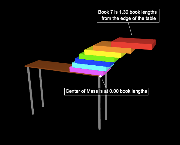 All books go in one direction, with sliders underneath to control each one’s position relative to the book beneath. The checkbox at the top controls a line showing the center of mass of the stack that is being actively moved.