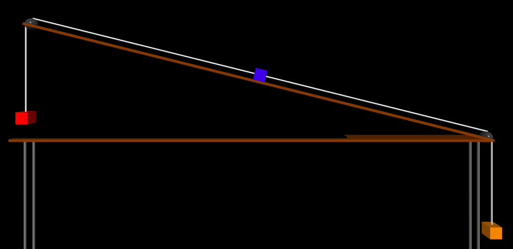 Similar to the previous simulation, but informed by additional experience both teaching and programming. The most obvious change is that there are now two hanging blocks instead of one. This allows for more complex labs or simulations. However, if either hanging mass is set to 0 kg, it disappears – and we return to a simpler, two-body Atwood machine. If both are set to 0 kg, they both disappear – and we return to the classic mass on an incline. As with the simulation above, this is designed so that it can be used as a remote lab and includes unknown values. Dig around if you would like to find the true values. Or get to calculating! (Or contact me.)